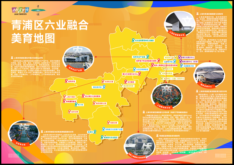 随着2026年上海市民文化节青浦区“城市美育日”如约启幕,青浦六业融合美育地图正式发布。新民晚报记者了解到,该地图以水为脉、以文为魂、以业为基,打破文、商、旅、体、展、农六业边界,串联起全区美育阵地、艺术场景、体验线路与消费空间,精心擘画六条主题美育路径。