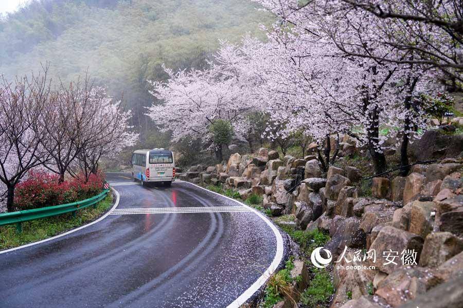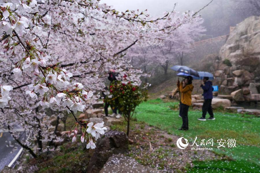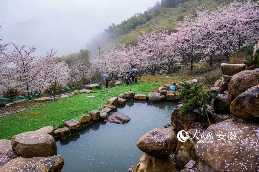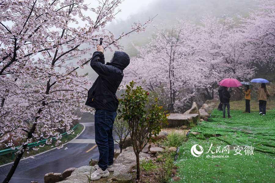广德牛山樱花盛开,游客在春雨中赏花。人民网记者 苗子健摄